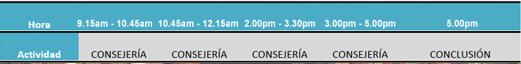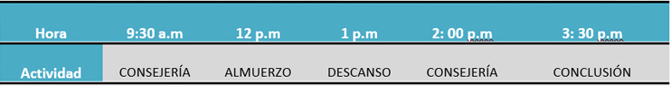 Anotaciones:El programa diurno requiere de suma puntualidad, incluye prácticamente tres sesiones de consejería) dos seguidas en la mañana y una en la tarde, un almuerzo y sus respectivos cafecitos. Es necesario que el participante haga el depósito del costo del programa a nuestras cuentas bancarias una semana antes. Traer abrigo es sumamente importante, lo mismo que la indicación previa de si no consume algún determinado tipo de alimento.