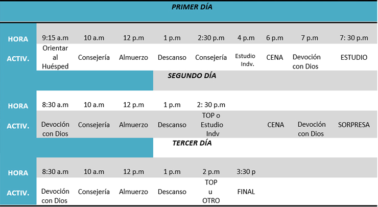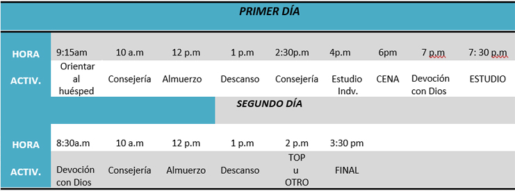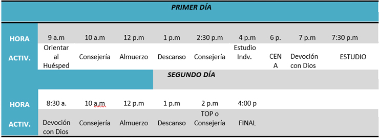 Anotaciones:Este programa de dos días incluye el hospedaje de nuestros aconsejados, una noche en nuestras instalaciones, sus respectivas comidas, tres sesiones de aconsejamiento que abarcan un total de cinco horas y media, dos estudios bíblicos, momentos de descanso, un rincón terapéutico donde la persona reflexiona sobre su situación por medio de un material de lectura y audio que usan personalmente, una terapia de oración profunda que será indicada por el respectivo consejero o bien algún afinamiento más de su proceso de aconsejamiento con su consejero. Informar sobre comidas o medicamentos y traer abrigo. Hay que hacer depósito anticipado en nuestras cuentas bancarias.